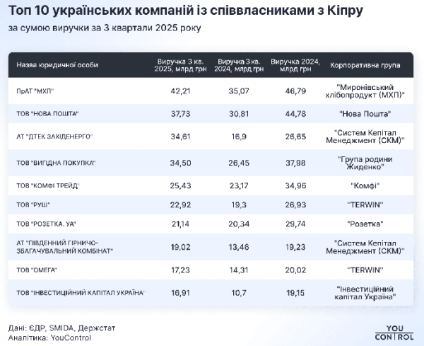 Агропромислова група МХП стала лідером рейтингу вітчизняних фірм з кіпрськими співзасновниками за розміром доходу за перші три квартали 2025 року.