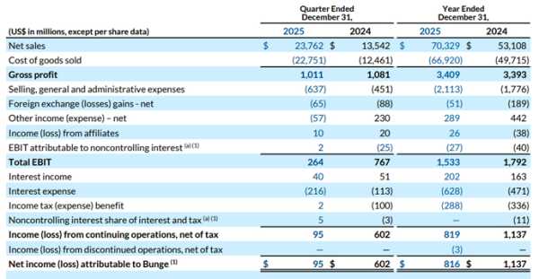 За результатами діяльності в 2025 році, корпорація Bunge зафіксувала чистий прибуток у розмірі $816 млн, що демонструє зниження на 28% у порівнянні з ідентичним результатом попереднього року ($1,137 млрд).