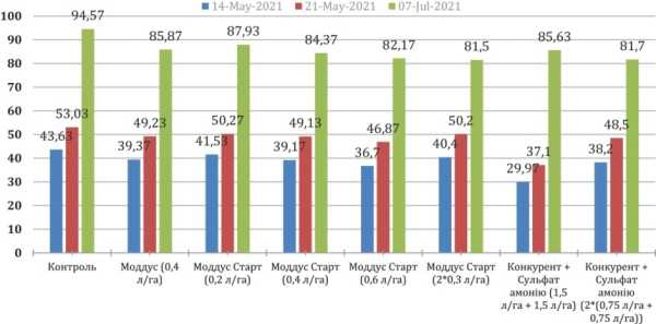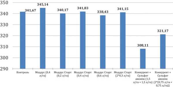 • як видно із графіка 2, при застосуванні у фазу ВВСН 31 Моддус® та Моддус® Старт не мають негативного впливу на продуктивний стеблостій, проте на ділянках, де було використано конкурентний продукт, падіння (зменшення) продуктивного стеблостою спостерігалось на рівні 5–12 % відносно контрольної (необробленої) ділянки;