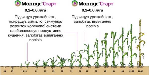 На пізніх термінах висіву восени та на посівах, де навесні спостерігається строкатість, зрідженість і на період весняного рівнодення (20–21 березня) ще не досягнуто оптимальної фази розвитку озимої пшениці й озимого ячменю (кущення), варто вносити Моддус® Старт у нормі 0,2–0,3 л/га у фазу розвитку культури ВВСН 13–22 (три листки — початок кущення). Це допоможе збільшити продуктивне кущення і стеблостій, покращити розвиток кореневої системи, вирівняти розвиток рослин. Проти вилягання оптимальною для застосування є фаза кінець кущення — початок виходу в трубку (ВВСН 29–31). Норма внесення для озимої пшениці та ячменю — 0,3–0,6 л/га. Для скорочення підколосового міжвузля і загального габітусу варто провести повторну обробку у фазу прапорцевого-підпрапорцевого листка (ВВСН 37–39) у нормі 0,2–0,3 л/га.