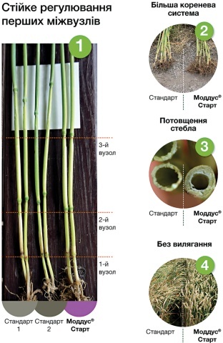 Моддус® Старт має значний вплив на довжину і масу коренів. Під час досліджень (польових, тепличних та лабораторних) було встановлено, що для збільшення об’єму, довжини та маси коренів норма використання Моддус® Старт повинна становити у зернових колосових культур 0,1–0,3 л/га. Відмічено збільшення довжини коріння на 10–40 %, а об’єм та кількість мікрокоренів також збільшувалися на 10–30 %. У всіх дослідженнях спостерігався позитивний вплив Моддус® Старт на ріст і розвиток кореневої системи, порівняно з контролем (без ретарданта). Перевагою у збільшенні кореневої системи є підвищення ефективності використання азоту, фосфору, калію та води (вологи), а також стресостійкості. Дослідження, які проводяться по всьому світі, зокрема в Україні, демонструють відмінну ефективність щодо зменшення висоти рослин, продуктивне кущення та позитивний вплив на збереження (збільшення) врожайності зернових культур, що і можна спостерігати на графіках та фото, які подано нижче.