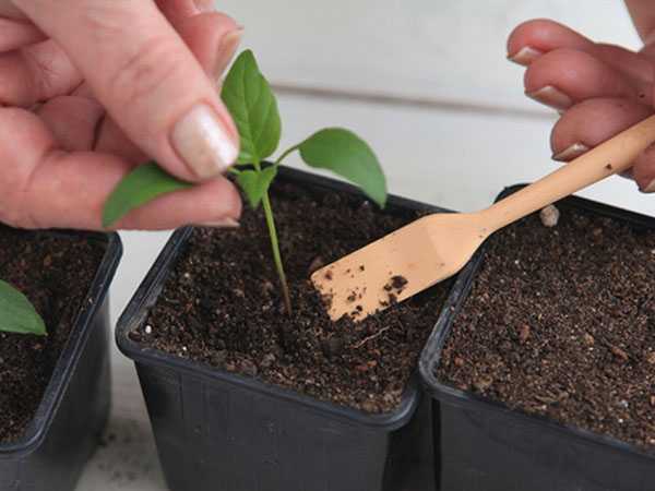 Почву в общей емкости поливают, чтобы сеянцы легко отделялись без отрыва корешков. Почву берут такую же, как и для посева. Сеянцы при этом не заглубляют – присыпают землей до утолщения над корешком – точки роста. Хорошо поливают теплой водой.