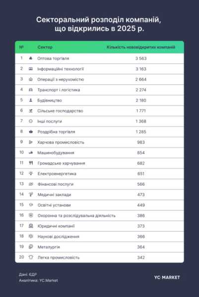 В Україні в 2025 році було зафіксовано 1 771 новостворену агрофірму. Усього в державі було відкрито 28 913 нових підприємств, в той час як 2 871 підприємство завершило свою діяльність.