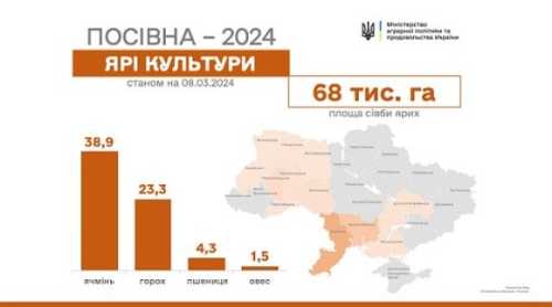 Вже дванадцять областей розпочали посівну ярих культур. Станом на 7 березня в Україні засіяно 68 тис га. З них – 4,3 тис га пшениці, 38,9 тис га ячменю, 23,3 тис га гороху та 1,5 тис га вівса.