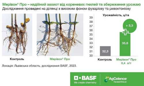 Департамент BASF Agricultural Solutions оголосили про вихід на ринок нового протруйника на сою – Мерівон® Про. Цей препарат призначений для контролю кореневих гнилей (фузаріозної, ризоктоніозної, пітіозної), антракнозу, пероноспорозу, аскохітозу, фомопсису, пліснявіння насіння.