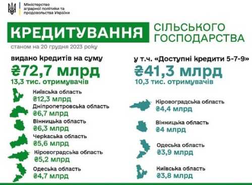 У 2023 році 13,3 тисяч агрогосподарств одержали 72,7 мільярдів гривень банківських кредитів на розвиток бізнесу. Переважна частина з них – 10,3 тисяч агропідприємств – було профінансовано за державною програмою «Доступні кредити 5-7-9%» на суму 41,3 мільярдів гривень.