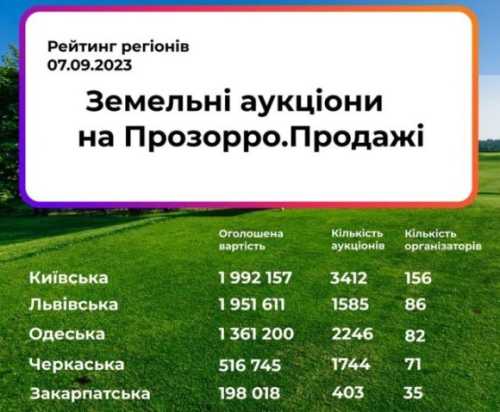 Лідерами за кількістю оголошених земельних аукціонів є Київська, Одеська, Черкаська, Львівська та Закарпатська області.