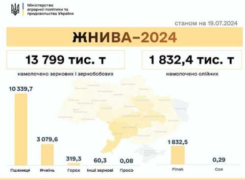- ріпаку – обмолочено 779,1 тис. га, намолочено 1,8 млн. тонн насіння;